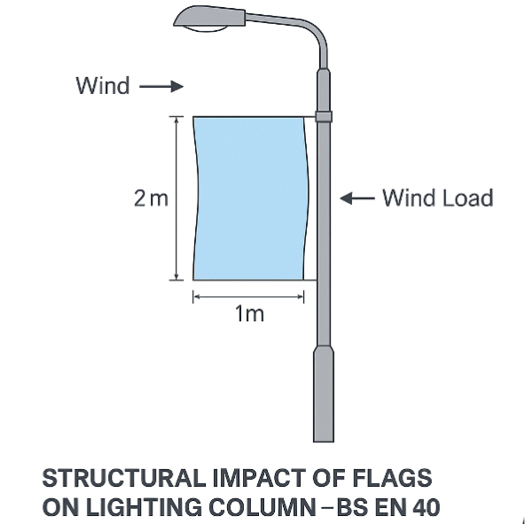 ETL’s analysis demonstrates that, from a purely engineering standpoint, the structural loading introduced by a typical small fabric flag is negligible when assessed in accordance with BS EN 40. Safety concerns surrounding such installations are therefore more likely to relate to fixing methods, maintenance access or unauthorised use of the highway, rather than the column’s ability to withstand the load itself.